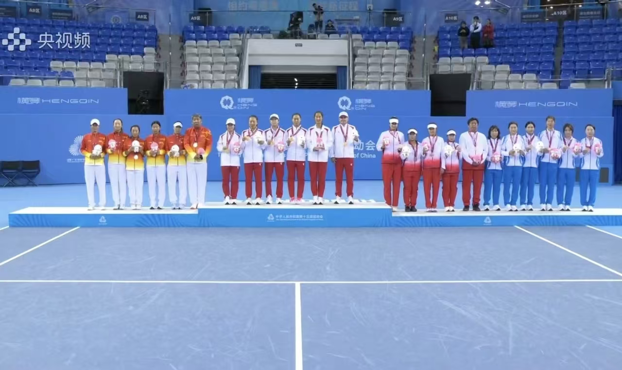 吴汝茜(左一)与队友及教练在第十五届运动会网球项目女子团体赛颁奖现场