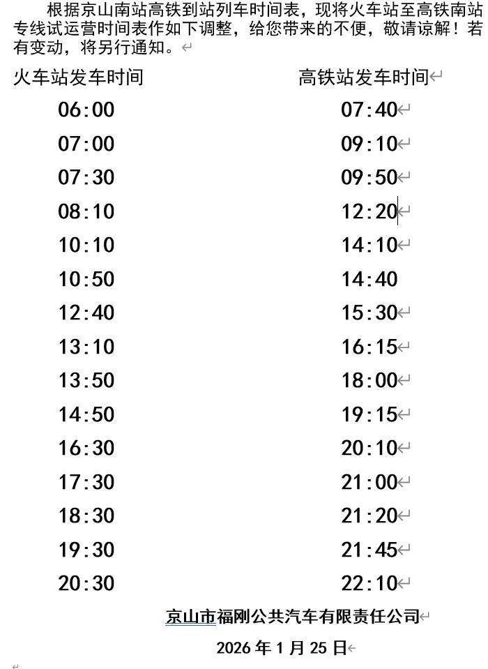 2月13日,笔者从京山市福刚公共汽车有限公司获悉,春节期间京山南站高铁大巴专线(火车站——高铁站)运营时间已作出调整,除夕当天(2月16日)仅运营半天,其他运营时间保持不变。