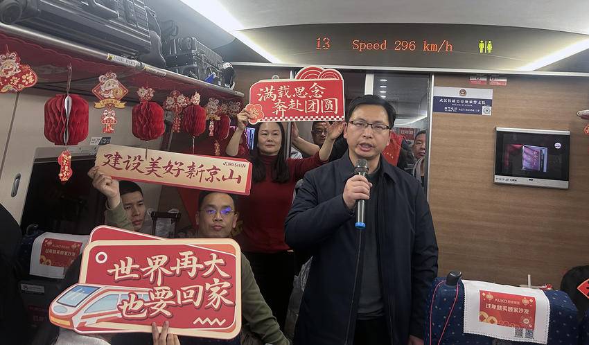 2月8日,G1032次列车载着600余名在粤京山籍务工经商人员,向北疾驰,直达京山南站。这是京山市2026年“圆梦高铁·接您回家”活动开行的首趟免费返乡专列。