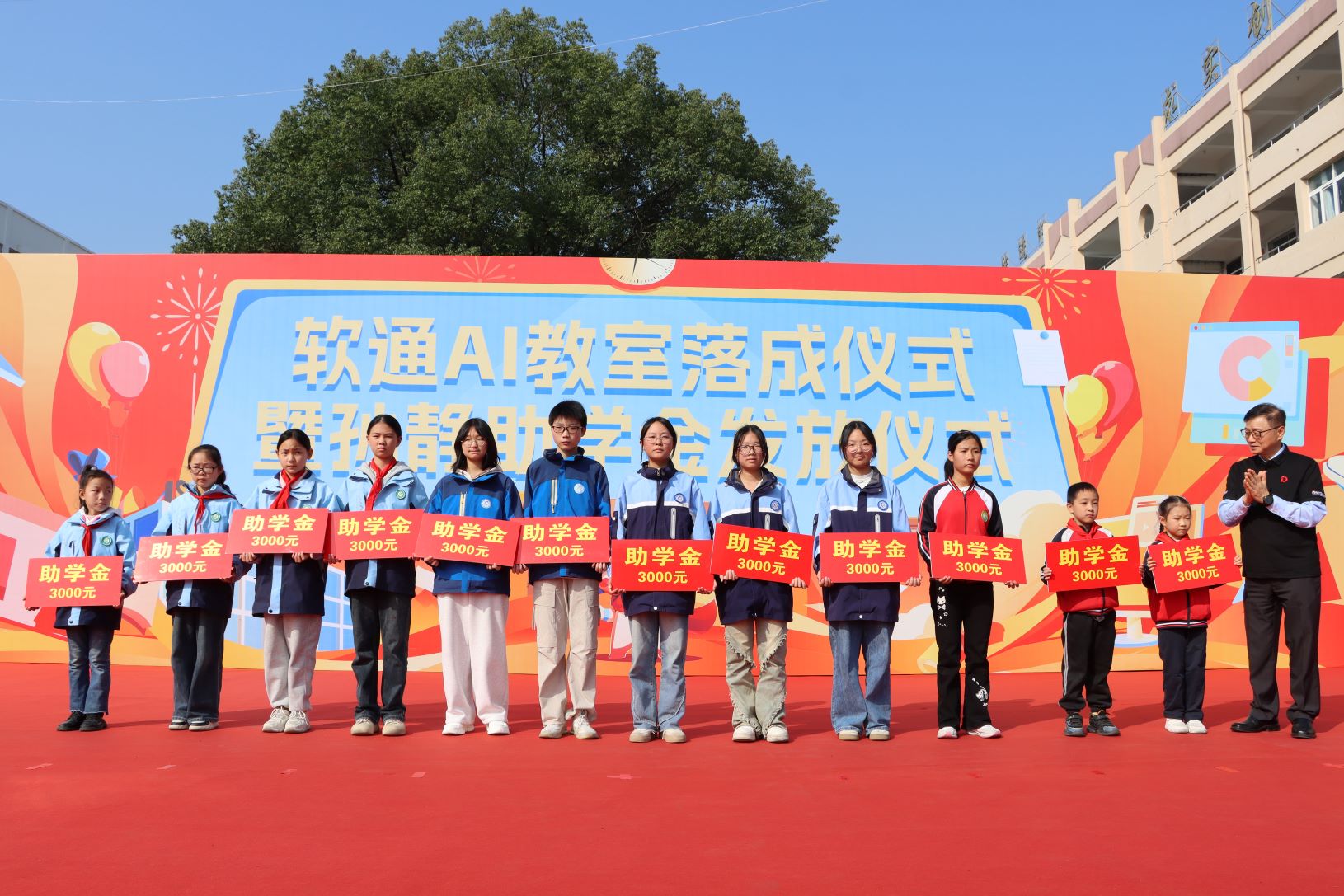 活动现场为59名优秀学生、16名优秀教师和先进教师、12名受助学生发放孙静助学金共计10万元。坪坝镇初级中学和坪坝镇中心小学向软通动力集团回赠牌匾。