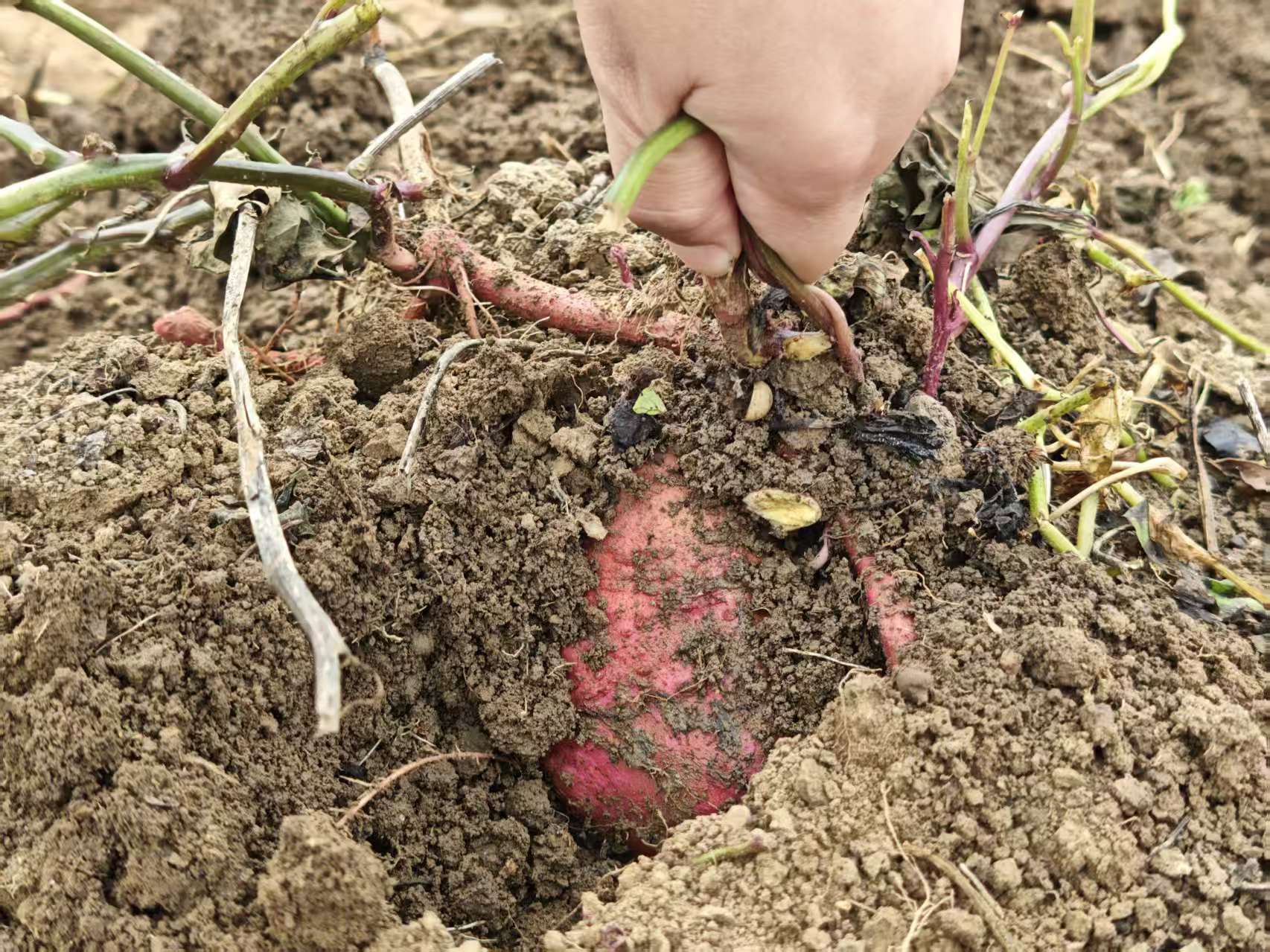 来到绿林镇向集村的地头,放眼望去,青绿色的红薯藤蔓已经提前被处理掉了,只剩红色土壤里一垄垄的板栗薯在旋耕机的前进下,翻出了土。村民们有条不紊地开挖、分拣、装袋,新鲜饱满的板栗薯被陆续运离田间,空气中弥漫着清甜的薯香。