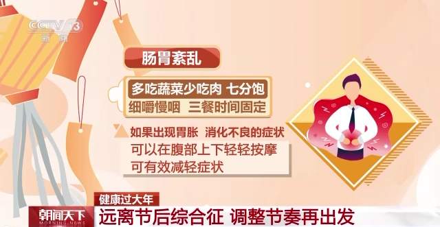 肠胃紊乱:多吃蔬菜少吃肉,七分饱,细嚼慢咽,三餐时间固定。如果出现胃胀、消化不良的症状,可以在腹部上下轻轻按摩,可有效减轻症状。
