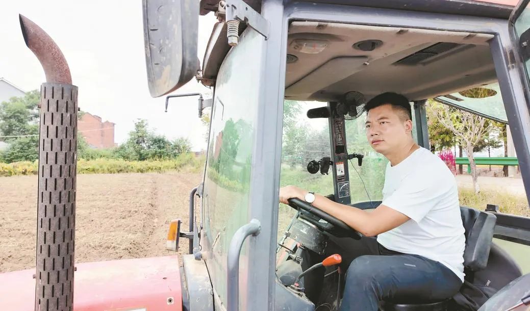 退役军人杨愉锐开着旋耕播种机为农户服务。 记者 余涛 摄