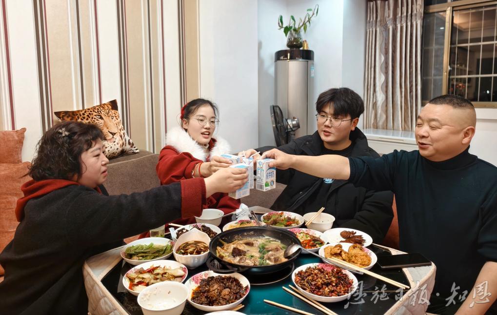 袁娜从早上就开始忙活。莴笋炒香肠、酸辣土豆片、炖了一上午的腊蹄子,一盘一盘端上桌……潘媛希、谭哲和廖利秀在一旁打下手。