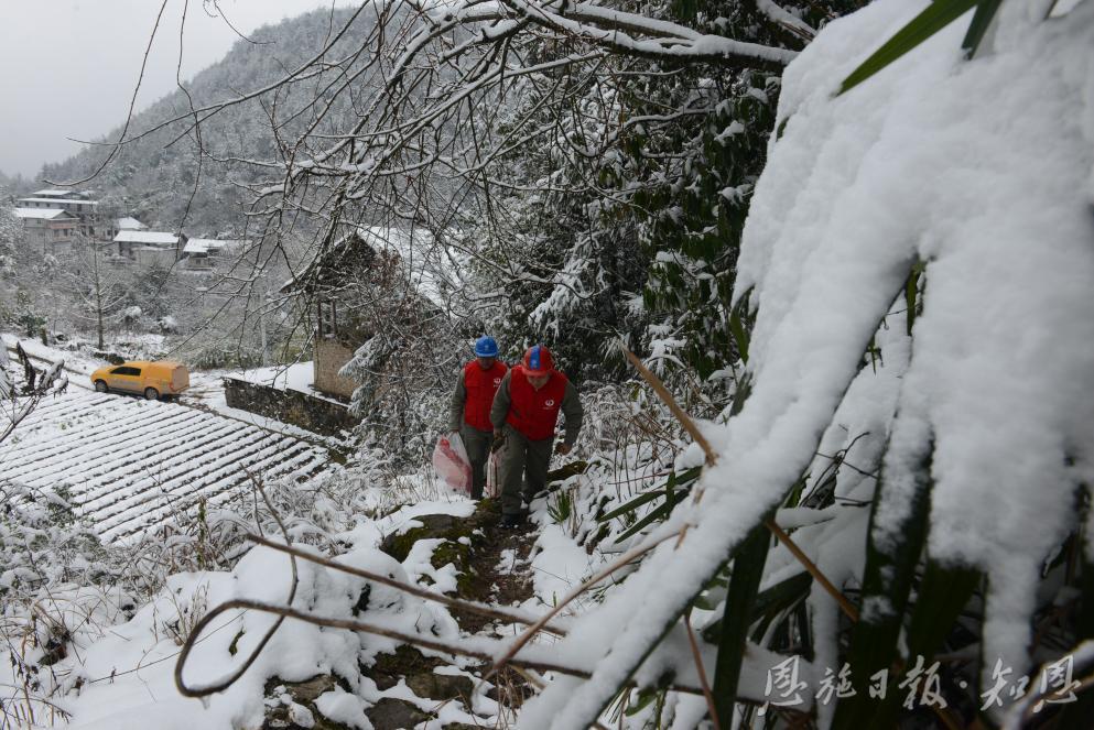去年除夕前夜,大雪封山。有农户家停电,老人等着用电做雾化治疗。潘李华和同事们绑上草绳,在雪地里一步步往前蹚。