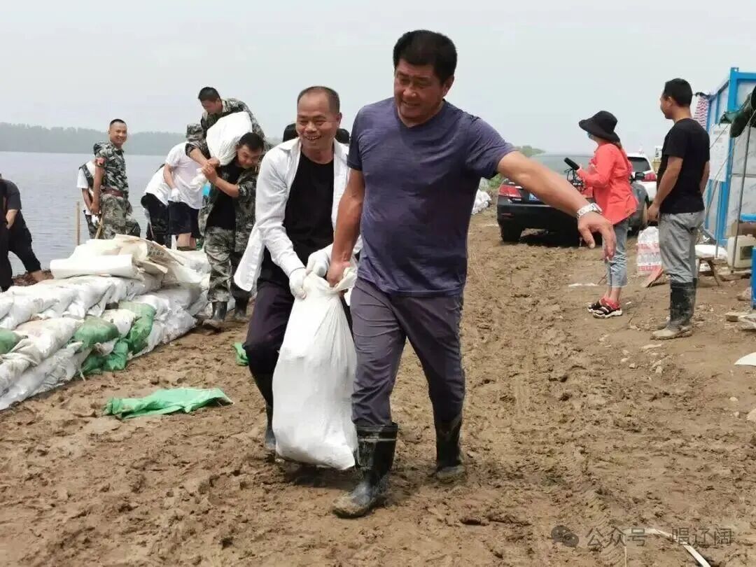 每次防汛,吴劲松(蓝色衣服者)总是冲在最前面