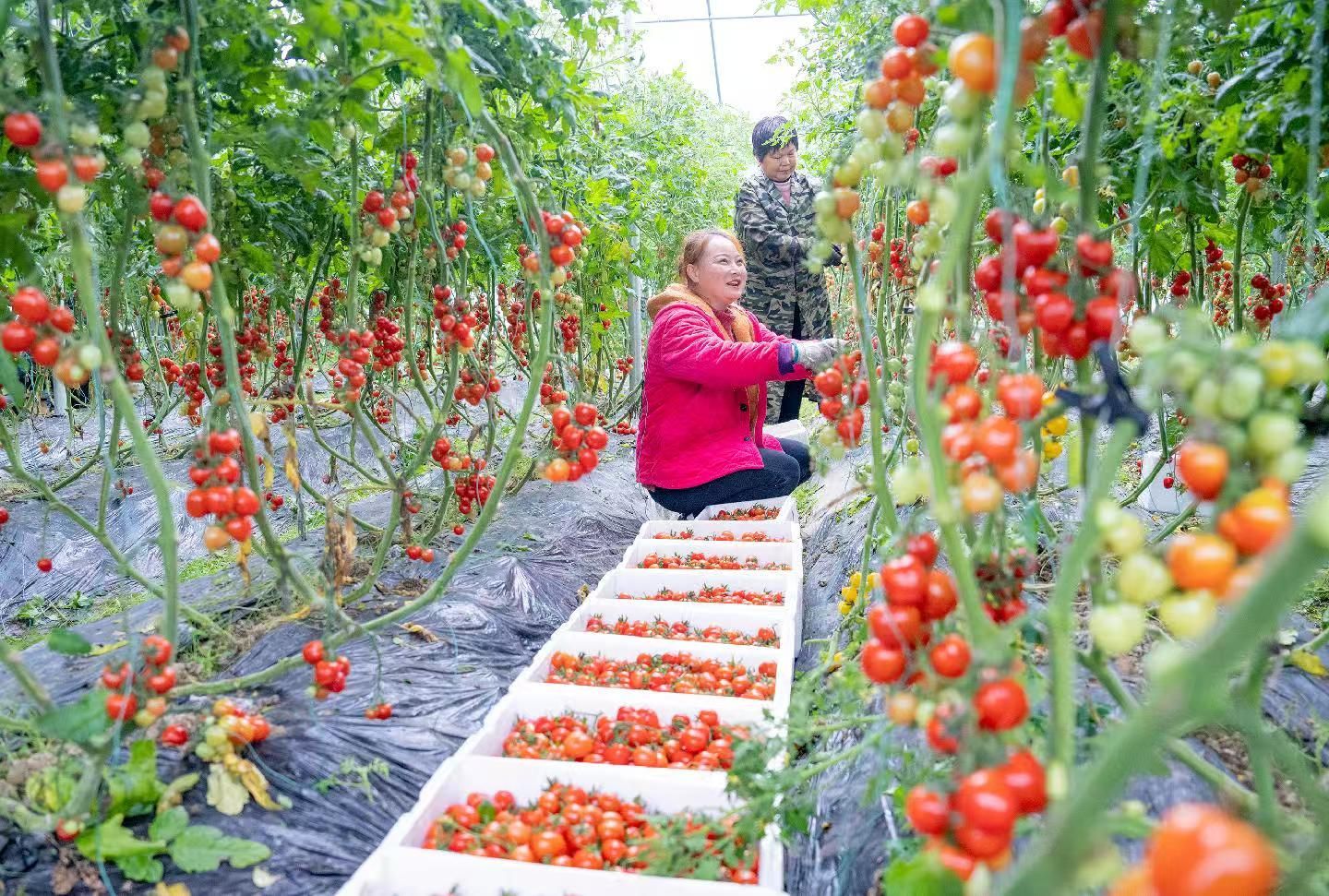 在湖北东冶农业科技有限公司种植基地,一串串红彤彤的小番茄沉甸甸地缀满藤蔓,在绿叶的映衬下格外诱人,工人们穿梭其中,脸上洋溢着丰收的喜悦。
