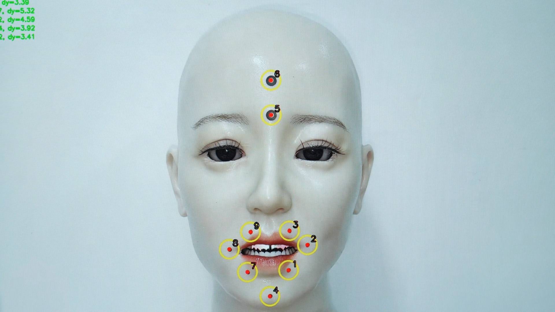 为实现精准表情,团队在机器头内布置了22个电机,配合计算机视觉算法提取的人脸100多个特征点,驱动眉、眼、鼻、唇、下巴等部位。从第一代的10个电机、基础运动,到第三代的22个电机,已能做出18种基于心理学、行为学研究的微表情。