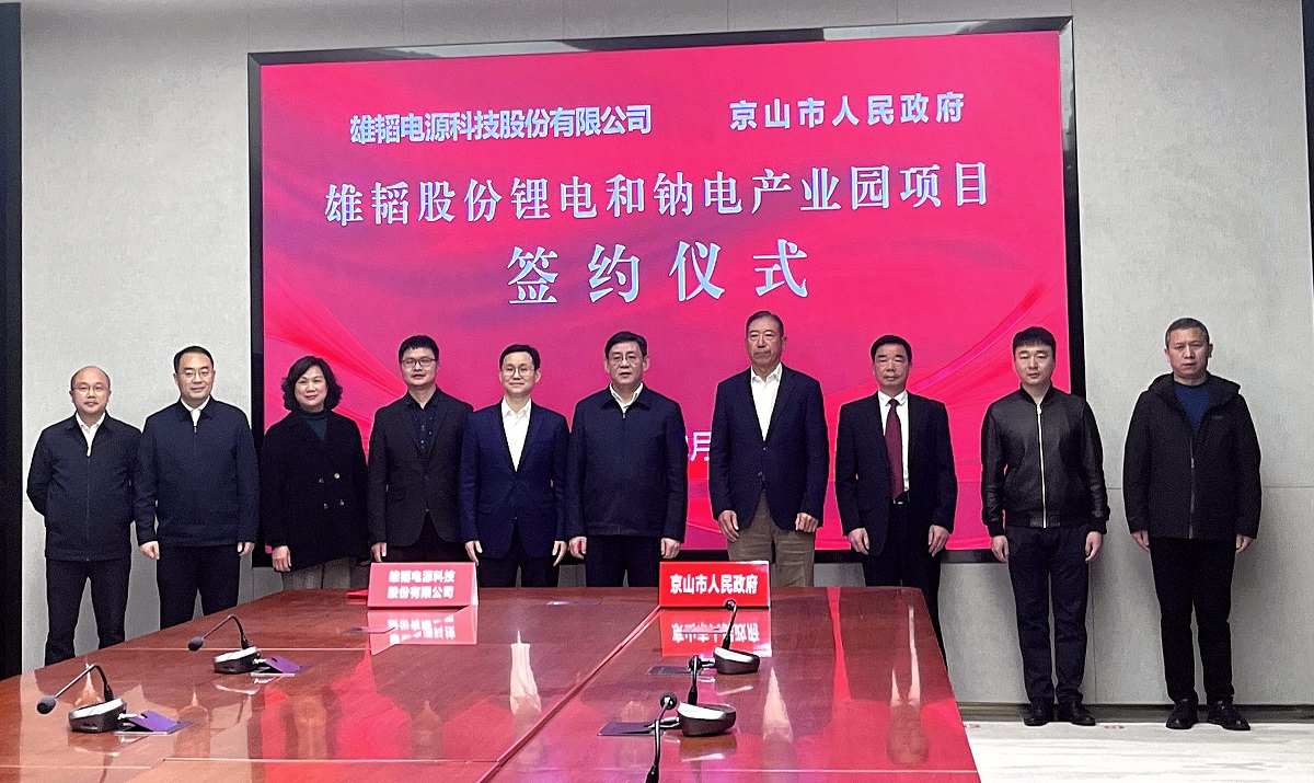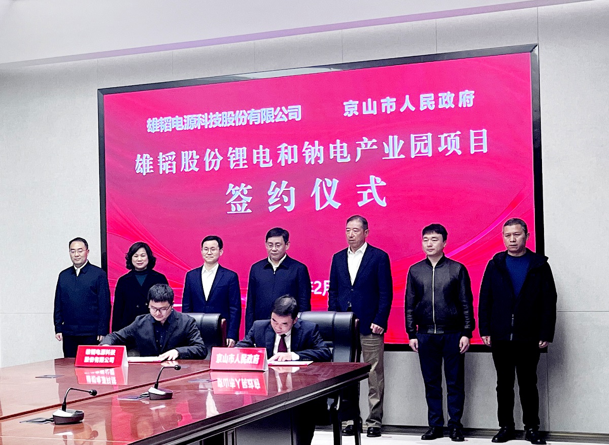 2月8日,雄韬股份锂电和钠电产业园项目签约仪式举行。荆门市委书记胡亚波,市委副书记、市长陈家伟,副市长刘国芳,雄韬集团董事长张华农,雄韬股份锂电超级工厂总经理郭盼,京山市委书记张勇出席仪式并见证签约。市委副书记、市长何洪涛主持签约仪式。市委常委、常务副市长钱先斌代表市人民政府与雄韬集团副总裁、深圳氢雄总经理陈宏一同在协议书上签字。市政协副主席、市招商服务中心主任张琼慧参加活动。