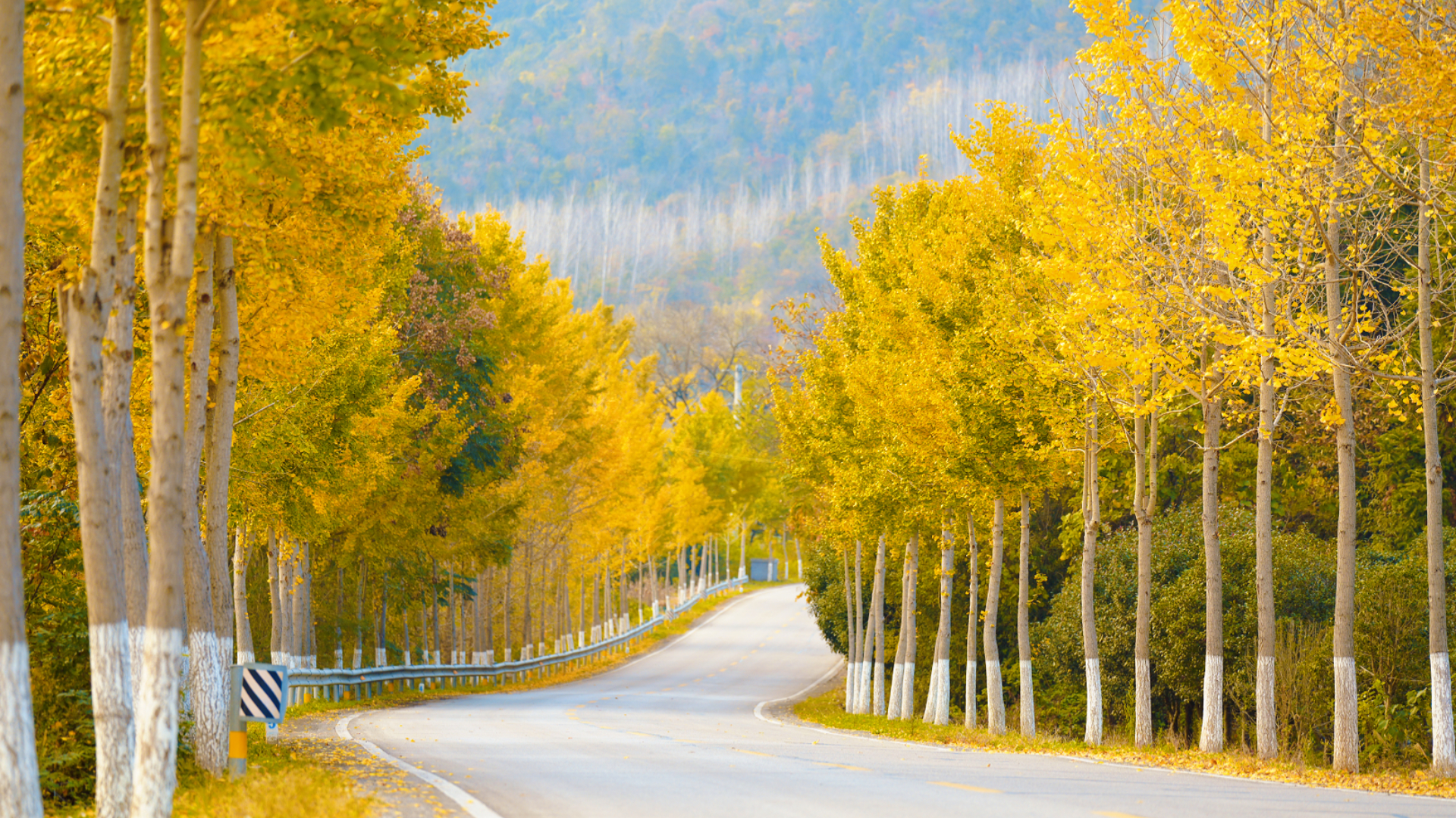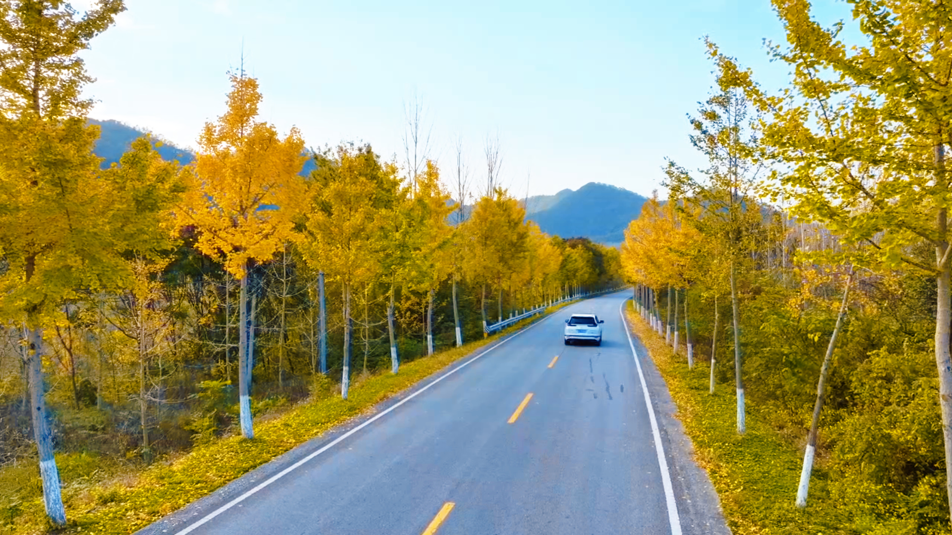 杨集的秋日,都浸在这条银杏大道里。蜿蜒路面两侧,银杏树列队成鎏金长廊,扇形叶被秋阳镀得透亮,风过时簌簌抖落,铺就软黄的路沿。 阳光穿透枝桠,在柏油路上织出细碎光斑,车辆驶过带起叶声沙沙,远处山峦笼着淡蓝雾霭,衬得满树金黄更暖。树干裹着浅白漆痕,与满地落金相映,连风里都浸着草木的清润。