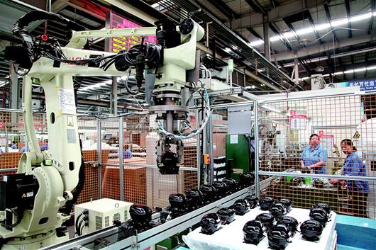 图为:5月22日,东贝压缩机生产线终端,一只智能机械臂正在对即将出厂的冰箱压缩机打包堆码。﹙视界网李国平摄﹚劲牌公司投资100亿元,建设健康白酒产业园;华新水泥投入54亿元,打造百年复兴基地;